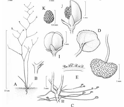 Abb. 1. A: Habitus von Philcoxia minensis. B: Hochblatt an der Infloreszenz. C: Ansatz der nach oben strebenden Blätter am etwas geschwollenen Stamm. D: Blatt von unten und rechts daneben die Blattoberseite mit den zahlreichen stalked capital glands . E: Querschnitt durch die Lamina. I: Samenkapsel. K: Samen. J: Teilweise geöffnete Samenkapsel mit Samenkörnern. Abbildungen nach Fritch et al. (2007) jedoch ohne H, F und G, die Blütenstrukturen darstellen (auch von Pereira and Oliveira in McPherson 2010, p. 1095 wiedergegeben, dort aber A verändert und B weggelassen).