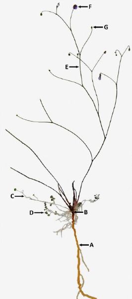 Abb. 3. Ganze Pflanze verkleinert (ebenfalls aus Pereira et al. 2012). Die kleinen 0,5 bis 1,5 Millimeter kleinen zur lichtdurchfluteten Oberfläche des Quarzsandes strebenden Blätter sind wieder gut zu erkennen. A: Wurzelsystem. B: Kurzer aufrechter Stengel. C: Lateraler ’stem’/Petiolus. D: Blattspreite. E: Zweig des Blütenstandes. F: Blüte. G: Frucht.