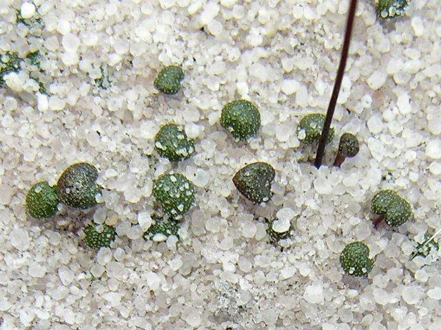 Abb. 4. Blätter von Philcoxia minensis. Sand weggeblasen (photo by Pereira and Oliveira in Stewart McPherson 2010, p. 1089). Man findet sie – gemäß obigem Zitat – gewöhnlich "at, or immediately below, ground level” (also auch "at") oder mit Fritsch et al. (2007, p. 453) "lamina subterranian or (when mature) at soil surface”.
