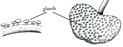 KONVERGENZEN: Klebfalle (flypaper trap/adhesive leaves displaying (a) stalked capital glands producing (b) sticky substances (c) on the upper leaf surfaces, (d) luring, (e) capturing, (f) digesting prey (nematodes and other soil organisms), (g) showing phosphatase activity (h) on the surface of the glandular trichomes, (i) absorbing the prey’s nutrients (j) metabolizing the animal proteins into Philcoxia species specific proteins). 4